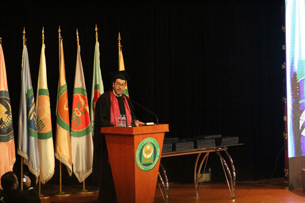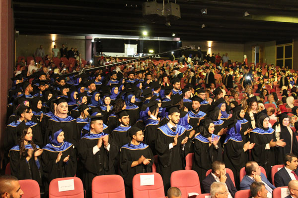 تخلّل الاحتفال عرض أفلام حول الأنشطة الطلابية والمؤتمرات العلمية والثقافية والدورات التي تقوم بها الجامعة خلال العام. ثم بدأ "يكن" تقديم الدفعة الخامسة والعشرين وتوزيع الشهادات على الخريجين بحضور نائب رئيس الجامعة والعمداء والمحافظ رمزي نهرا والشيخ مظهر الحموي، ردّد بعدها الطلاب قسم التخرّج.