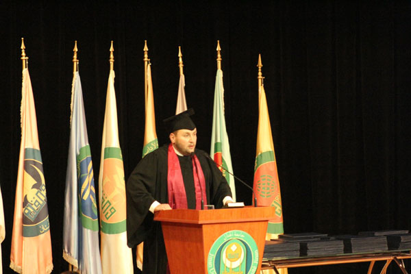 كلمة الخريجين لمرحلة الدراسات العليا ألقتها الطالبة الدكتورة رابعة يكن قائلة: "كم يعزّ علينا نحن المتخرجين مفارقة صرح أكاديمي مجيد، لطالما عشقناه.. جمعنا بين جنباته سنين عمرنا. فاليوم تصحو المشاهد، وتعود ذكريات مشوارنا العلمي الطويل.