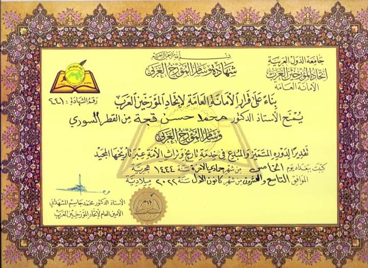 وبالمناسبة، قدّم الأمين العام لاتحاد المؤرّخين العرب في بغداد الدكتور "محمد جاسم المشهداني"، مُمثَلاً بالأستاذ في جامعة الجنان الدكتور "صالح زهر الدين"، وسام المؤرّخ العربي للأستاذ "قجّة" تقديراً لجهوده في هذا المجال.