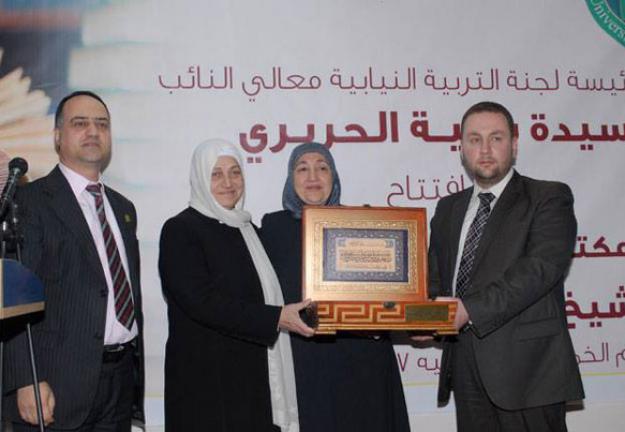 بعد ذلك قدّم رئيس مجلس الأمناء الأستاذ سالم يكن درعاً تقديرياً للنائب بهية الحريري ونسخة من المصحف الشريف لأرملة المفتي الراحل.